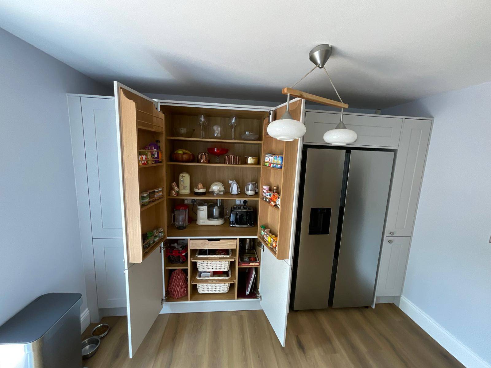 This client came to us after visiting a multinational retailer who couldn't offer any better design for her current space. We visited and recommended knocking the small wall down to open up the two rooms. We also suggested blocking up the window to have a tall bank of appliances, allowing us to install her wish list of a double pantry, pull-out larders, and a USA fridge freezer.