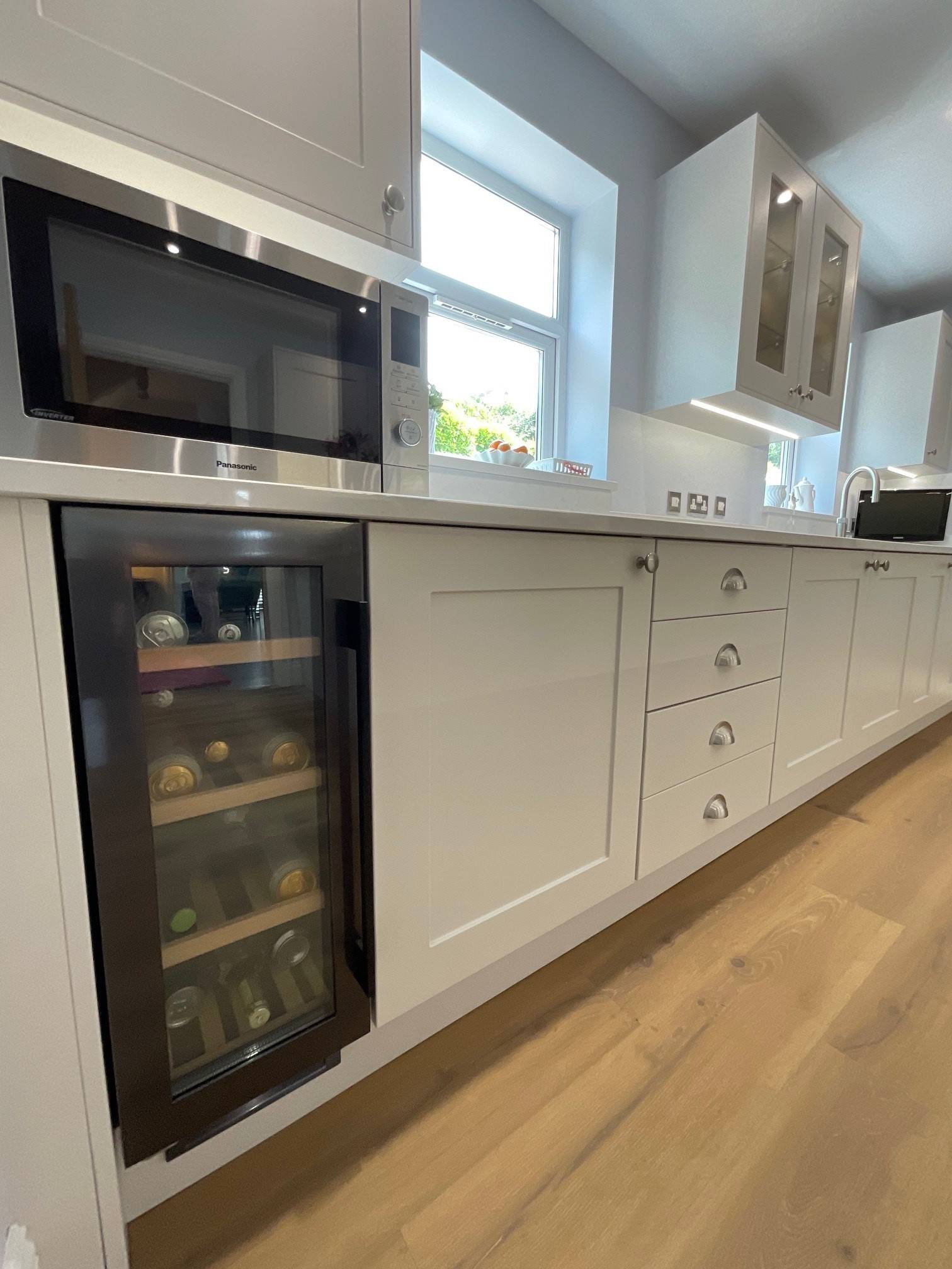 The door choice was our Princeton Harbour, painted in the main kitchen, with Pear Grey on the tall bank. Silestone worktops were chosen in Persian White with a 100mm upstand.